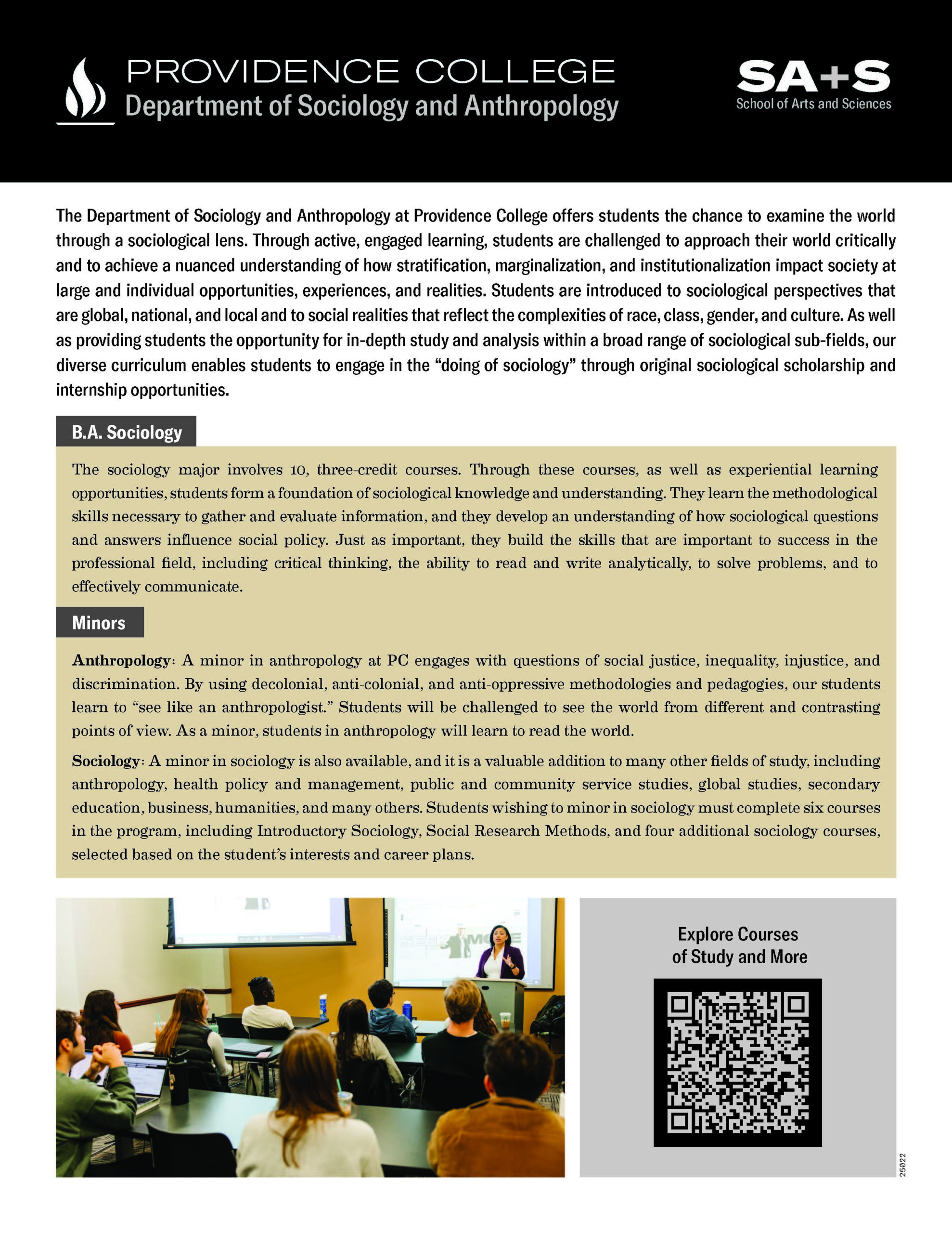 Students are introduced to competing perspectives and to social realities that reflect the complexities of race, class, gender, and culture. In addition to providing students the opportunity for in-depth study and analysis within a broad range of sociological sub-fields, our diverse curriculum enables students to engage in the “doing of sociology” through original sociological scholarship and internship opportunities. This broad range of courses provides students with the thinking, speaking, and writing skills necessary to pursue a variety of post-graduate endeavors, whether in the for-profit world, the non-profit arena, academia, or public service.